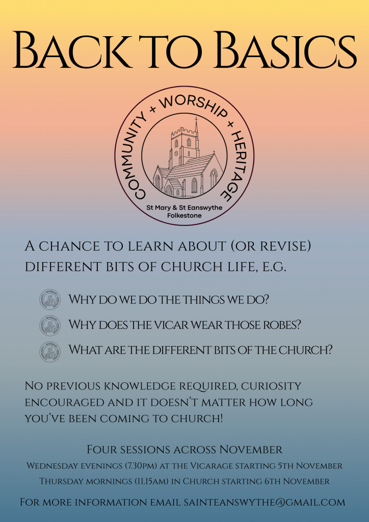 The Church of St Mary & St Eanswythe, with St Saviour Folkestone, exists to make Jesus Christ known in Folkestone through its worship, its fellowship and its mission. It looks to encourage its members, and the people of the community of which it is a part, to realise their full potential as children of God.