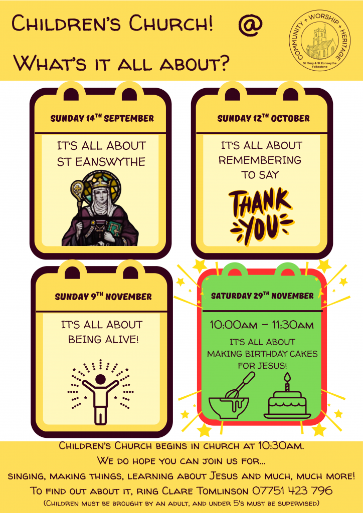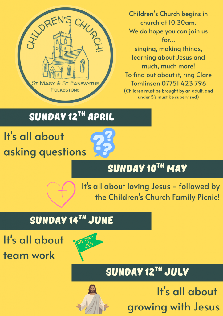 Your children are very welcome to participate in St Mary and St Eanswythe Children’s Church once a month.