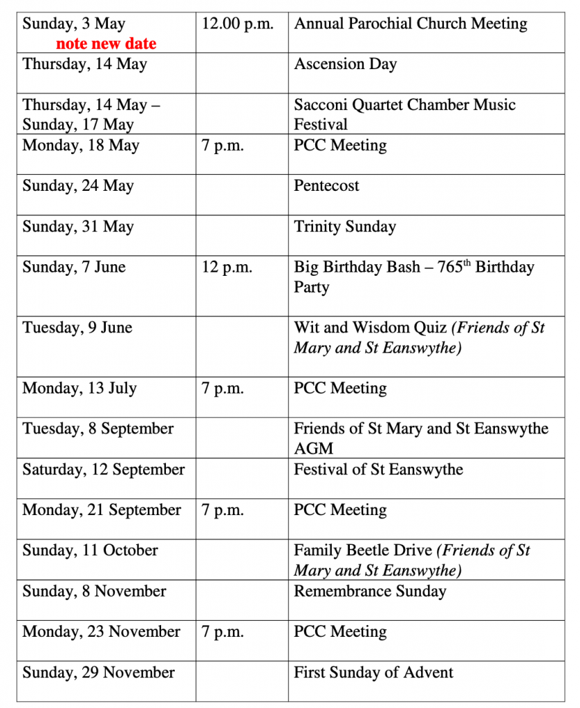 The church is normally open for visiting and private prayer between 11.00 and 13.00 on Mondays plus Wednesdays to Saturdays, subject to factors such as the availability of volunteer welcomers or special events such as services or concert/exhibition set up. We will try to give advance notice of planned closures on this page.